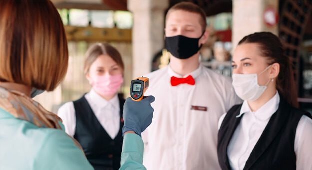 Cuando no se realizan en un esquema de autoservicio, los cambios en los procedimientos de check-in pueden incluir la instalación de calcomanías de piso para el distanciamiento social, divisiones en la recepción y estaciones de desinfección de manos. Algunos hoteles requieren que los huéspedes realicen controles de temperatura antes de ingresar o durante su estadía. "Nuestras medidas incluyen termómetros infrarrojos disponibles en la recepción para realizar controles de temperatura de nuestros huéspedes y empleados, de ser solicitado", dice Millennium Hotels.
