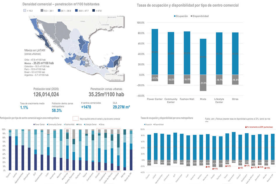 Al cierre del 2020, el registro de centros comerciales fue de poco más de 1,470 proyectos en operación, los cuales suman un GLA (Gross Leasable Area) superior a los 29.27 millones de m² rentables. Destaca Tinsa que, a pesar de la pandemia, en 2020 se observaron aperturas de nuevos centros comerciales, principalmente en las grandes ciudades del país.