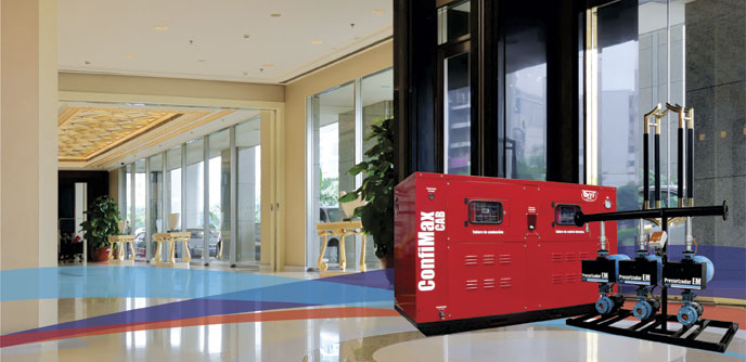 Por otra parte, ConfiMax® es un equipo para presurización de líneas hidráulicas dedicadas a la protección contra incendio, fabricado en capacidades desde 100 a 1,000 GPM. Este equipo es monitoreado por el Inspector®, un tablero de monitoreo remoto que asegura el funcionamiento del ConfiMax® las 24 horas del día. A manera de sustitución del cuarto de máquinas ofrecen dos opciones de reguardo para el equipo contra incendio, la primera es el CasCis®, una caseta cisterna pre-construida, y la segunda es el ConfiMax CAB®, una cabina hermética de lámina de acero que es resistente a la intemperie.