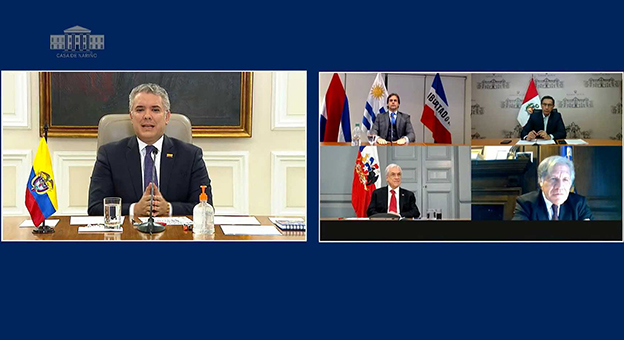 Los jefes de Estado explicaron los programas sociales que desarrollan en sus países para hacer frente a la crisis sanitaria, y elogiaron la tarea que se realiza en Colombia.