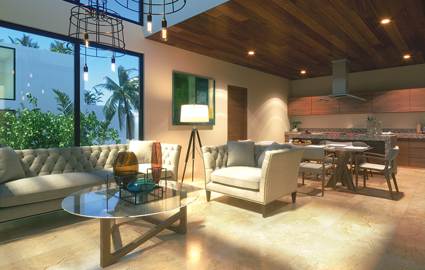 En el paraíso tropical de Tulum, rodeado por el mar color turquesa, exuberante selva y cenotes, las técnicas de construcción; los materiales que provienen de la zona tales como piedra maya, baharaque, maderas duras de la región, cumarú, traían, pacte; aunados a los detalles de pisos pulidos y mármol nacional, ayudan a crear espacios acogedores donde se siente la armonía con la naturaleza.