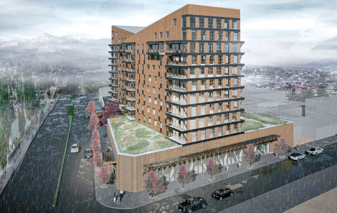 El proyecto recibió recientemente todos los permisos necesarios por parte de las autoridades para levantar los 12 pisos del edificio en la ciudad chilena de Coyhaique, puerta de entrada a la Patagonia. Juan José Ugarte, el arquitecto de la firma a cargo –junto con el arquitecto Gerardo Armanet y el ingeniero estructural Juan Acevedo-, dio a conocer que las obras comenzarán a finales de 2023, una vez que finalicen el proceso de financiamiento.