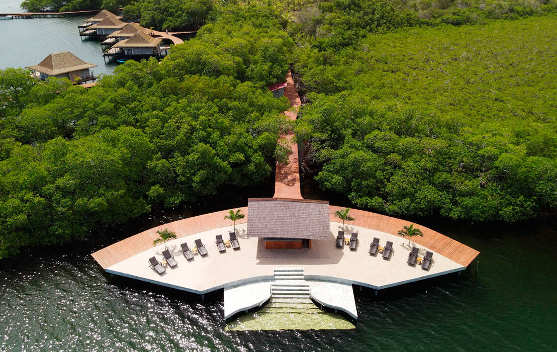 La playa flotante viene a ser la cereza al pastel de este idílico resort hotelero recientemente inaugurado (abrió en septiembre de 2021) y que se compone de 16 villas de lujo sobre pilotes en el agua, construidas especialmente en Bali y luego enviadas a Panamá. Algunas de las villas tienen piscinas privadas, y otras cuentan con un piso de vidrio incrustado, lo que permite a los huéspedes ver la vida marina debajo. Una serie de casas en árboles de bambú están ahora en desarrollo y se inaugurarán este año para aumentar la oferta del resort.